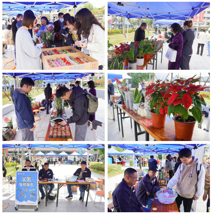 活动现场,轻快的背景音乐悠然奏响,师生们早已有序抵达并静候活动开始。在众人的期待中,活动缓缓拉开序幕。此次活动内容丰富多元、亮点纷呈,围绕师生需求与兴趣,精心规划了校庆蛋糕嘉人共享、佳肴美食展示品尝、嘉里学子厨艺秀、公益知识有奖问答、花卉绿植促销、商品平价售卖、义务维修服务、后勤服务现场咨询以及公益科普宣传等一系列精彩纷呈的活动项目,受到了师生员工的一致好评。