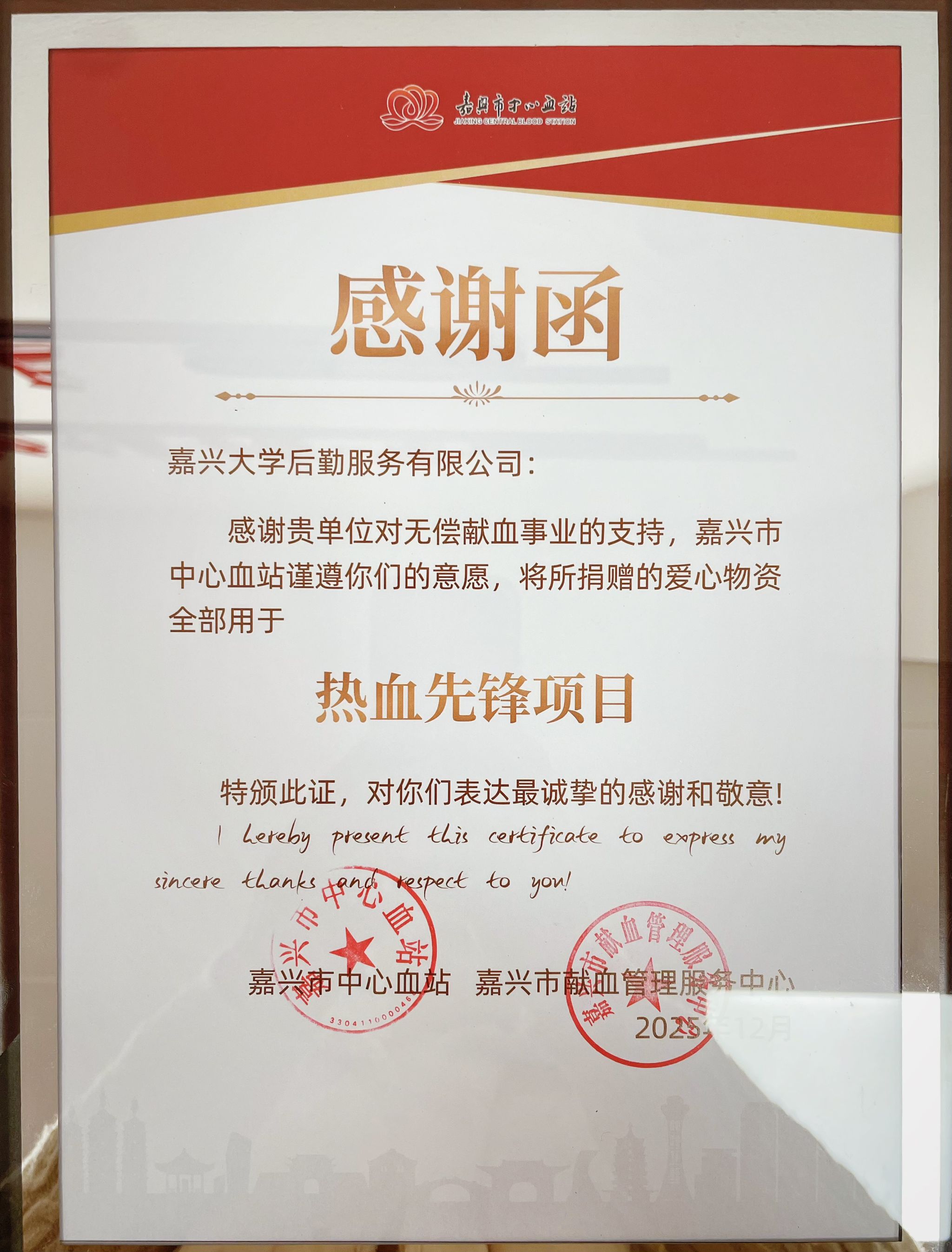 12月19日上午,我校后勤收到一份来自嘉兴市中心血站的感谢函。函中,嘉兴市中心血站对我校在组织无偿献血活动期间,后勤团队提供专业高效的服务保障、为献血工作的顺利开展保驾护航表达了诚挚谢意,我校后勤服务有限公司副总经理周华丽作为代表接受了这份感谢函。