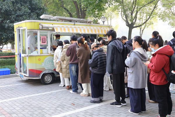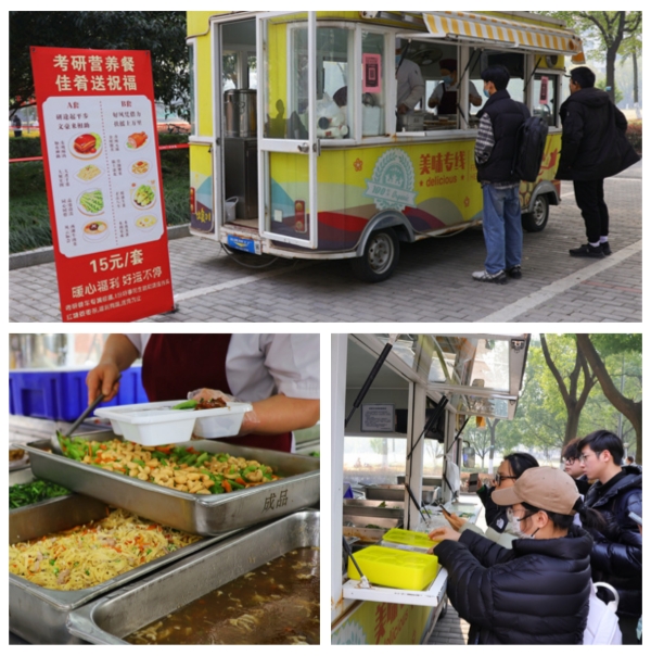 饮食服务部精准对接考生需求,于12月20日至21日推出系列暖心服务,以精细化保障为考生注入温暖与能量,用实际行动助力学子逐梦前行。考试期间,饮食服务部创新服务模式,协调校园移动街景车,在午餐时段将精心搭配的营养套餐配送至考场外,实现“餐食直达”,既节省了考生的时间,也确保其能及时补充能量。同时,街景车还配备暖心福利好事“花”生挞与特色热饮鸿运当头红糖姜枣茶,为冬日应考的学子驱散寒意、舒缓压力。此外,饮食服务部在考场周边设置考研专属休息点,在荷园餐厅一楼、二楼配备热水、红糖姜茶等物资,为考生提供舒适的临时休憩空间。饮食服务部以精准、细心、贴心的保障举措,让考生感受到校园的关怀与支持,为考研冲刺增添了温暖底色。