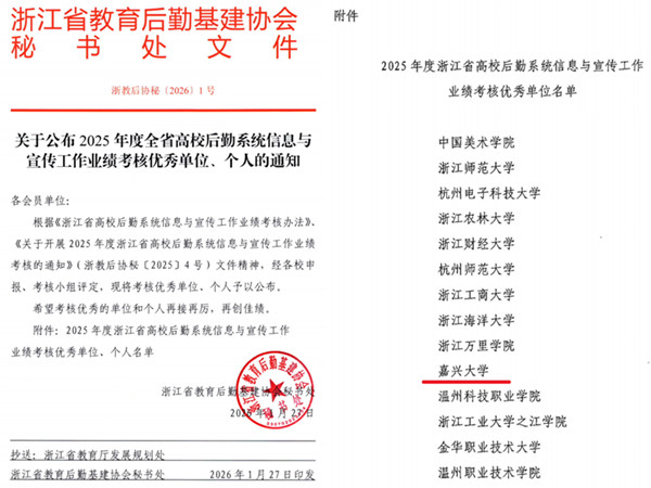 1月27日,浙江省教育后勤基建协会对2025年度浙江省高校后勤系统信息与宣传工作业绩考核优秀单位和个人给予表彰,我校后勤服务有限公司荣获“2025年度浙江省高校后勤系统信息与宣传工作业绩考核优秀单位”,季盈祺同志荣获“2025年度浙江省高校后勤系统信息与宣传工作业绩考核优秀个人”。