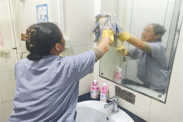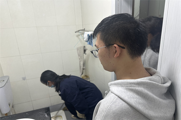 理论课结束后,同学们分成四组,在保洁阿姨的带领下走进寝室,学习卫生间深度清洁技巧。保洁阿姨向同学们分享说,清洁的核心就是“去垢、防潮、杀菌”, 洗漱台的水渍、皂垢,用白醋混合小苏打轻轻擦拭,就能轻松去除;水龙头上的水垢,一片柠檬就能搞定,环保又有效;地面和墙角用长柄清洁刷顺着缝隙刷洗,把毛发污垢清理干净后再拖洗通风,卫生间立马变得干干净净;马桶清洁也有小窍门,遵循“先冲后刷再消毒”的流程,洁厕灵静置10分钟后刷洗,再用稀释的84消毒液擦拭外侧,杀菌又卫生。同时,阿姨还分享了一些日常维护的小技巧:洗完澡及时通风,洗漱台下放个除湿盒,防止潮湿发霉;垃圾桶每日清理,避免滋生细菌。同学们认真观察,不时向阿姨请教问题。有同学感慨:“以前打扫都是表面功夫,跟着阿姨学会了高效方法,还体会到了保洁工作的不易,以后一定会更加珍惜整洁的环境!”