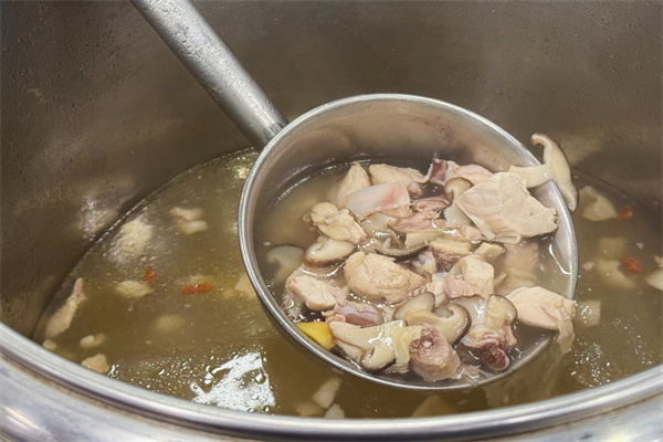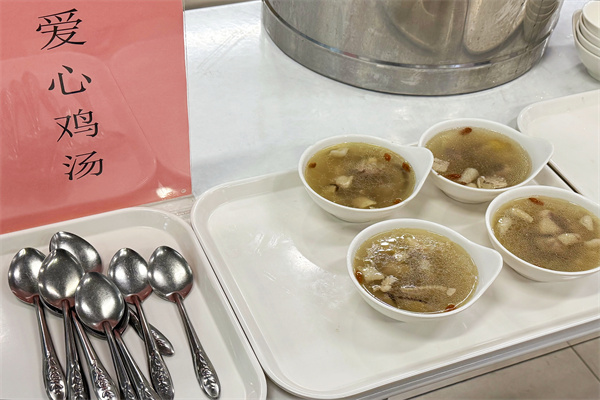 为保障爱心鸡汤的品质与足量供应,饮食服务部在食材甄选与炖煮工艺上层层把关。工作人员精心挑选新鲜鸡肉,搭配红枣、枸杞等滋补食材,科学兼顾营养与风味;食材处理细致入微,经焯水血沫、除杂质后,以文火慢炖数小时,让鸡肉的鲜嫩与辅料的醇香充分渗透交融。“献血后身体需要温和滋补,我们特意调控了炖煮火候与汤品盐度,既保证汤品鲜香醇厚,更注重契合献血师生的身体调理需求。”桂园餐厅负责人介绍道。